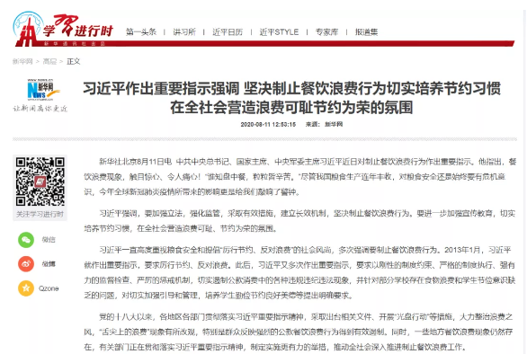 8月11日,國家主席習近平對對糧食浪費現象、特別是餐飲浪費做了批示。