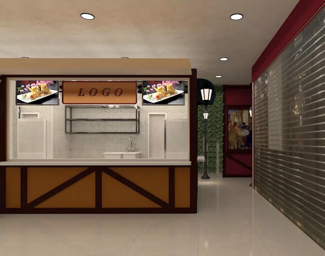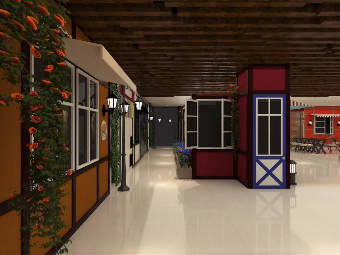 思索一段時(shí)間、最終晚上定案,繪制效果圖。將每一個(gè)檔口想象成一個(gè)小店面,于是框架就成了,將每個(gè)窗口做成窗戶(hù)的形式,于是帶有街邊開(kāi)店形式的出餐口就成了,最后用綠植、路燈做點(diǎn)綴,于是一個(gè)童話(huà)般的諾德丹麥美食城就成了。不出所料,OK!