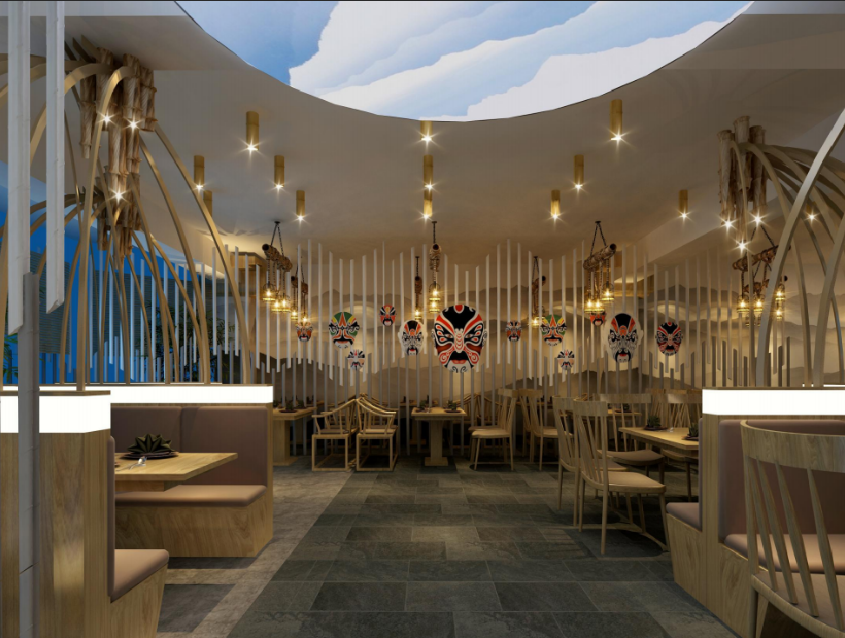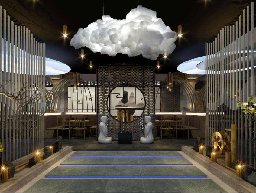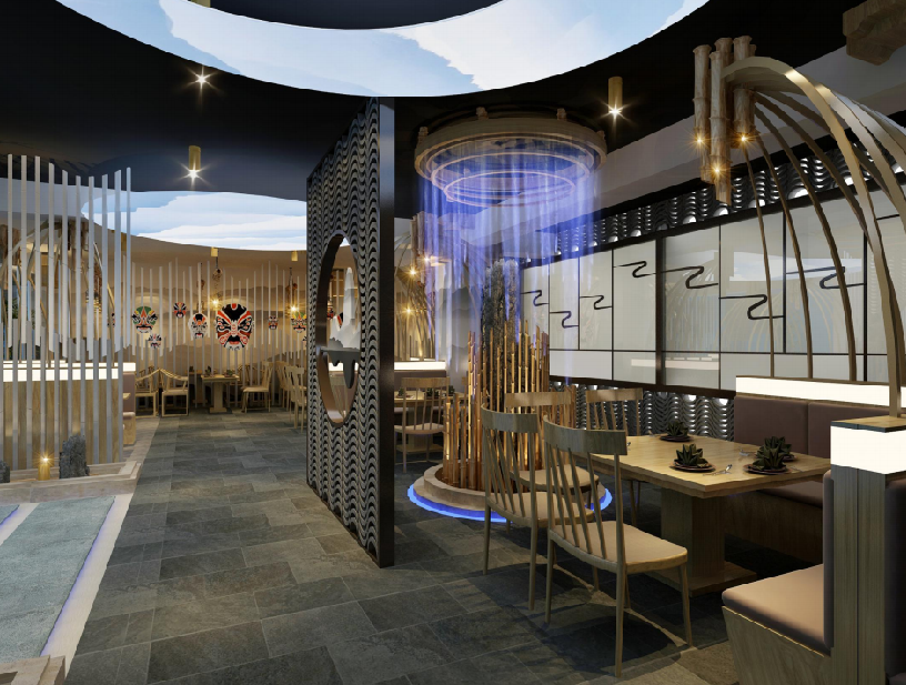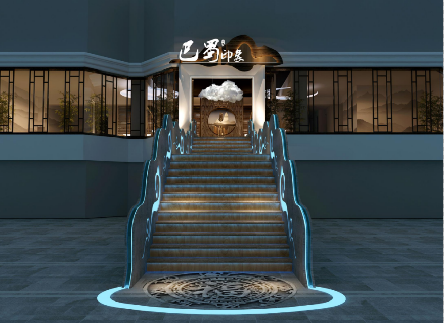 項(xiàng)目名稱:巴蜀印象 面積:360㎡ 地址:海淀區(qū)香山 造價(jià):65W 設(shè)計(jì)構(gòu)思 坐落于香山腳下的餐廳,為了更切合地理環(huán)境位置,滿足巴蜀印象香山店作為相比陸港城店的更高定位的餐廳。 本案將中式東方美學(xué)的設(shè)計(jì)理念,取之自然融于自然的手法作為空間設(shè)計(jì)的主題,同時(shí)寄予美好的寓意。 外立面的設(shè)計(jì)構(gòu)思為將扶手護(hù)欄用高山流水的方式隱喻出財(cái)源滾滾,匯聚一處之意。 內(nèi)部空間有自然環(huán)境的寫意表達(dá)以及賦予思想的呈現(xiàn),整體由外而內(nèi)相互呼應(yīng)協(xié)調(diào)。