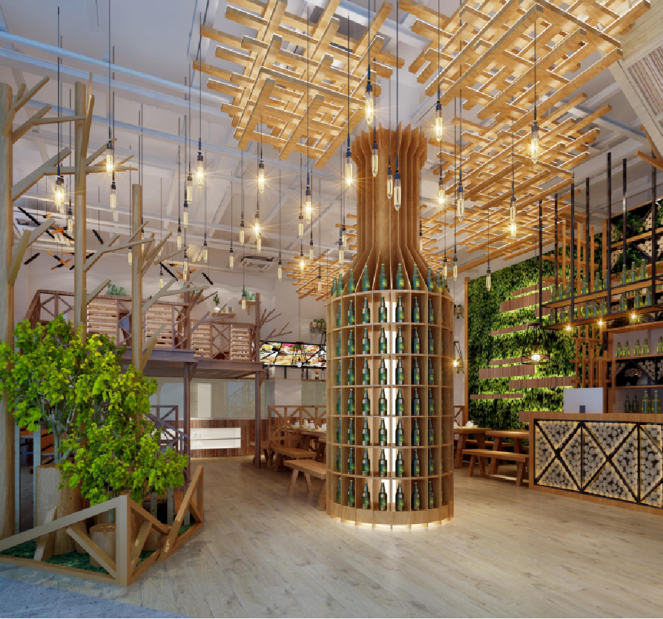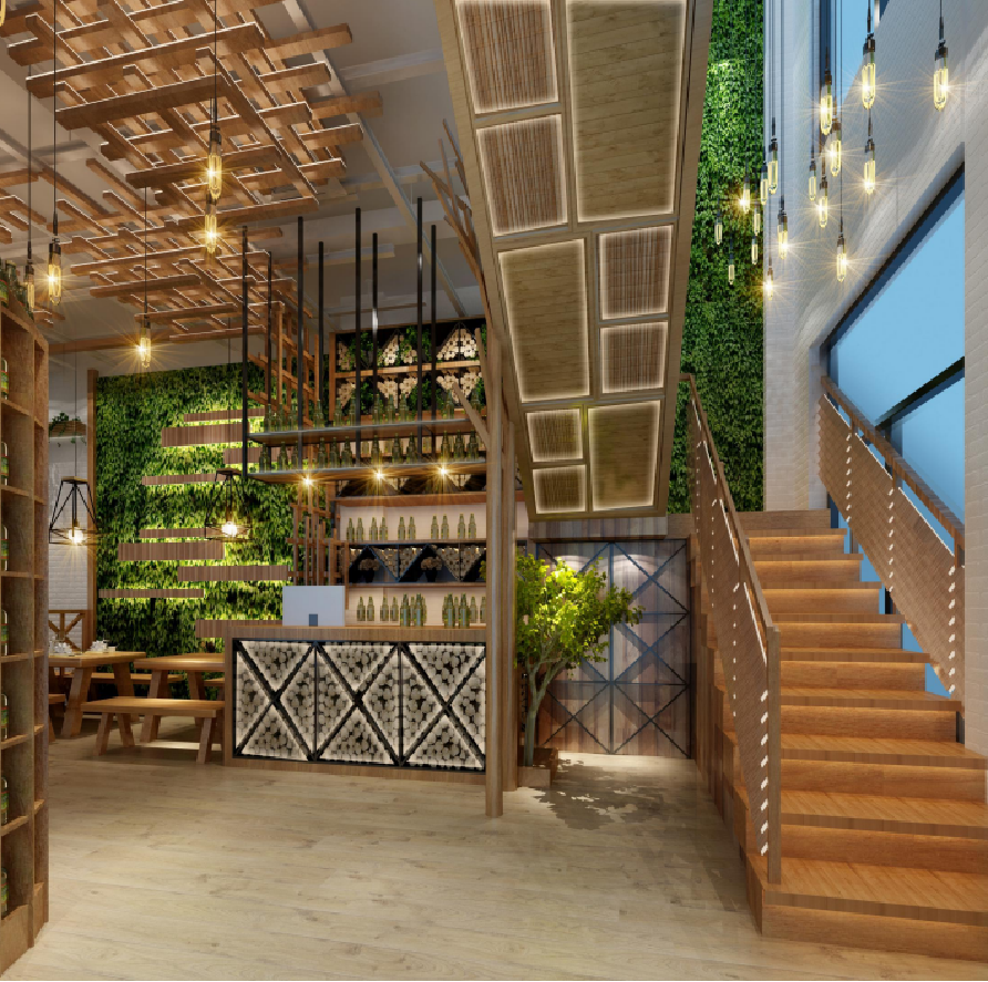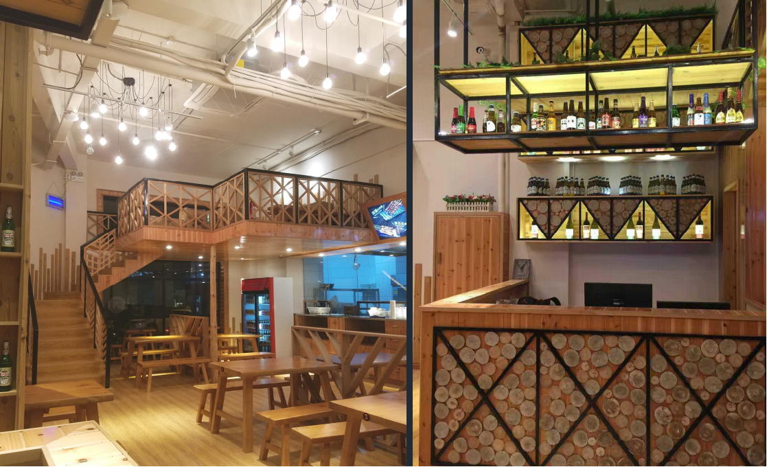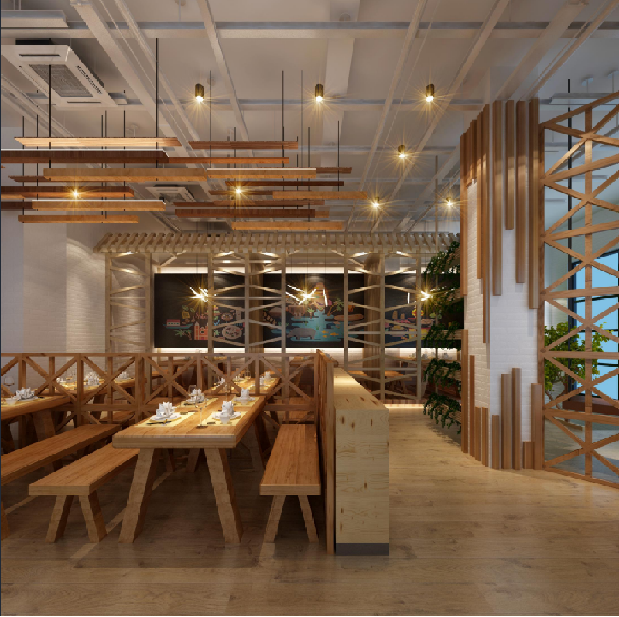 項(xiàng)目名稱:京味串吧 面積:260㎡ 地址:福建福州 造價(jià):65W 設(shè)計(jì)構(gòu)思 京味串吧,最初的定位是經(jīng)營者想回到自己的家鄉(xiāng)開一家北派的烤串店,彌補(bǔ)當(dāng)?shù)剡@一類餐飲的缺失。經(jīng)營者生活在北京,對(duì)北派的燒烤有者喜愛之情,與南方家鄉(xiāng)當(dāng)?shù)氐臒鞠啾龋l(fā)現(xiàn)經(jīng)過融入當(dāng)?shù)匾恍┨厣讼狄约凹右源钆滂F板經(jīng)營可作為餐廳的主要經(jīng)營定位。觀察商圈附近的餐飲形態(tài)狀態(tài),以及就餐環(huán)境,綜合考慮之后。餐廳的風(fēng)格定位為質(zhì)樸素然的簡約風(fēng)格。以原木木質(zhì)的材料通過形態(tài)的組合,燈光的搭配,呈現(xiàn)空間美感。