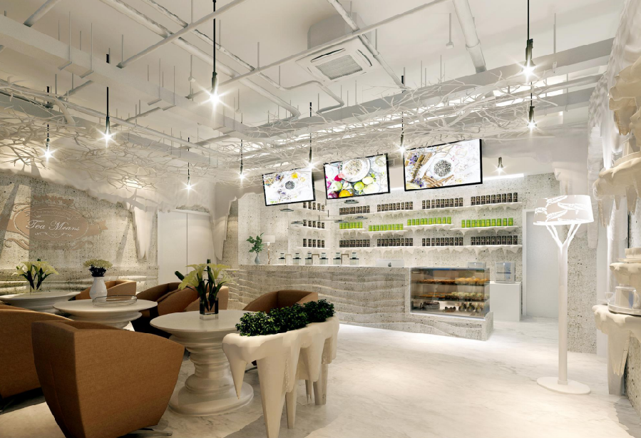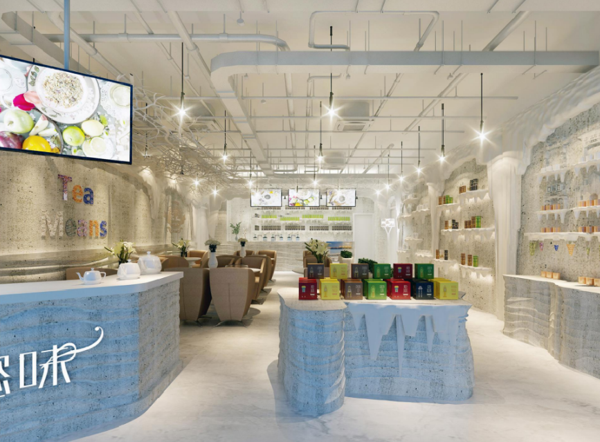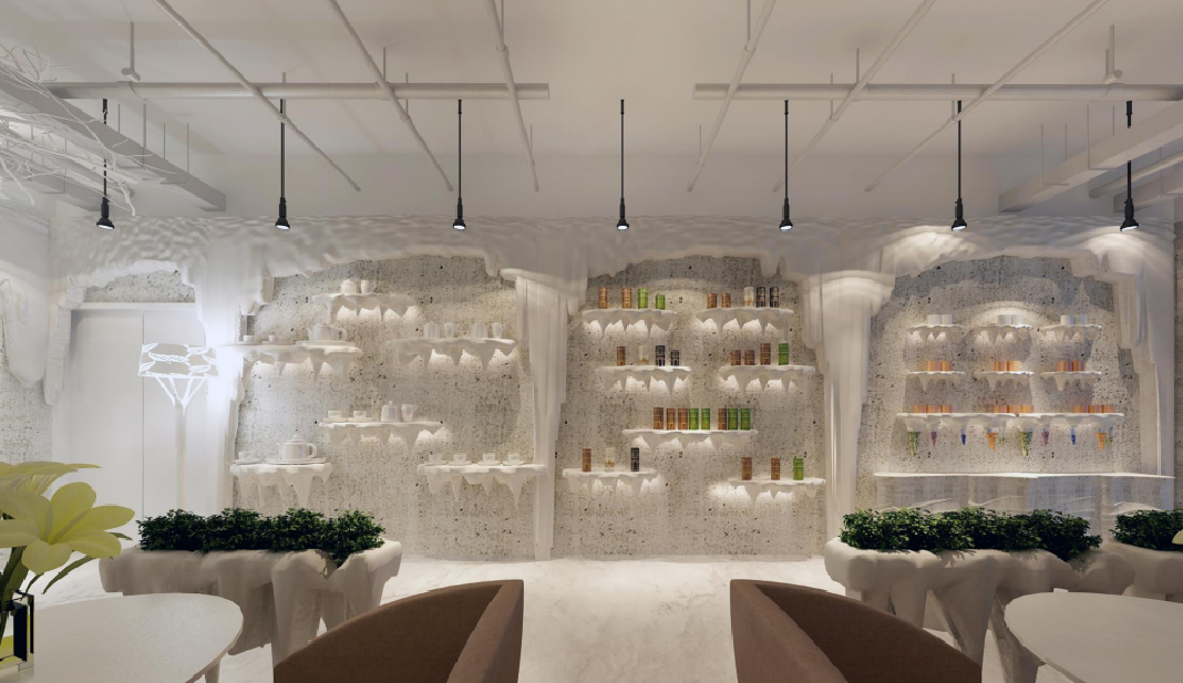 白色自然是空間最為合適的色素,加以灰色的融合,用自然風貌溶洞乳石的方式作為產品的承載。