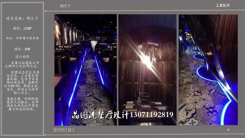 晶圖港餐廳設計裝修專家 設計構思 本案以經營各式中式烤肉小吃扎啤為主。經營業態定位為混合業態,工業復古海盜風格,包含節目演繹現場互動。客群定位為80-90,熱愛生活,音樂,時尚主義的年輕人為主。 海盜主題,科技既視感多元化融合。在啤酒音樂的交織中享受屬于好友的夜晚。