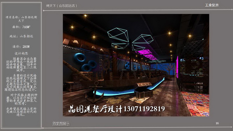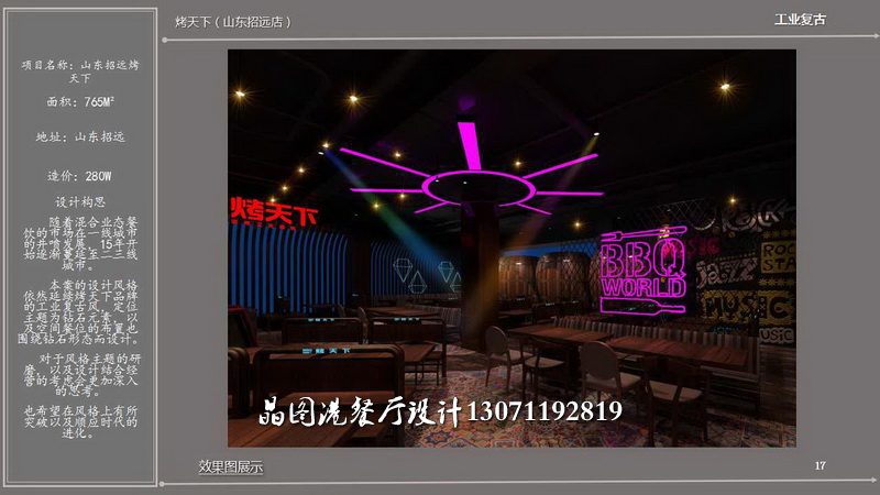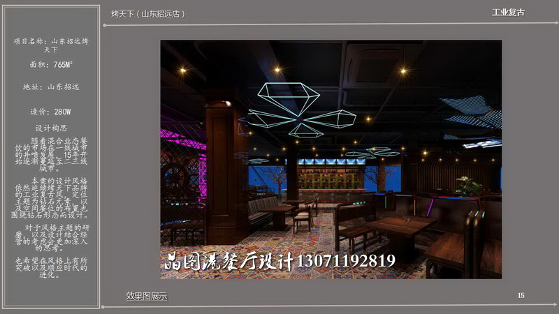 本案的設計風格依然延續烤天下品牌的工業復古風,定位主題為鉆石元素,以及空間餐位的布置也 圍繞鉆石形態而設計。