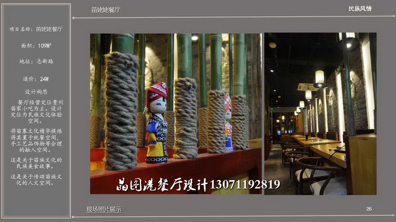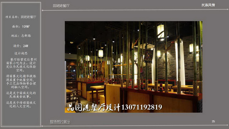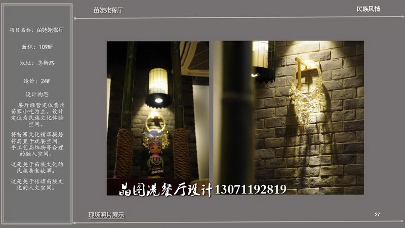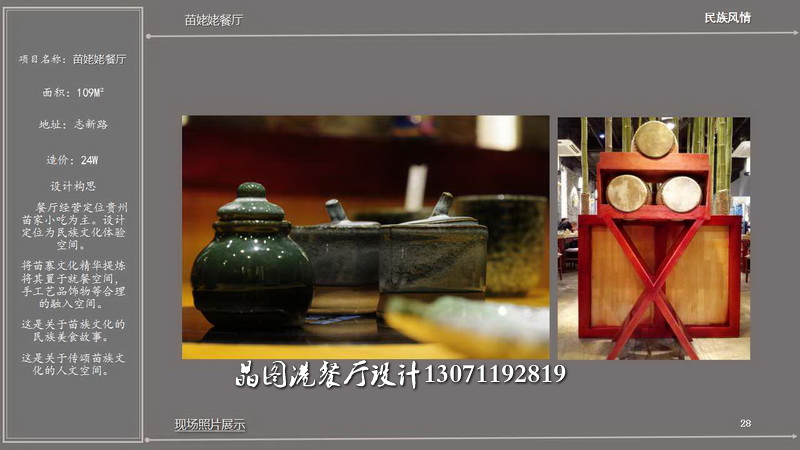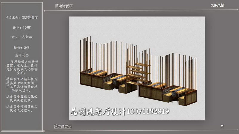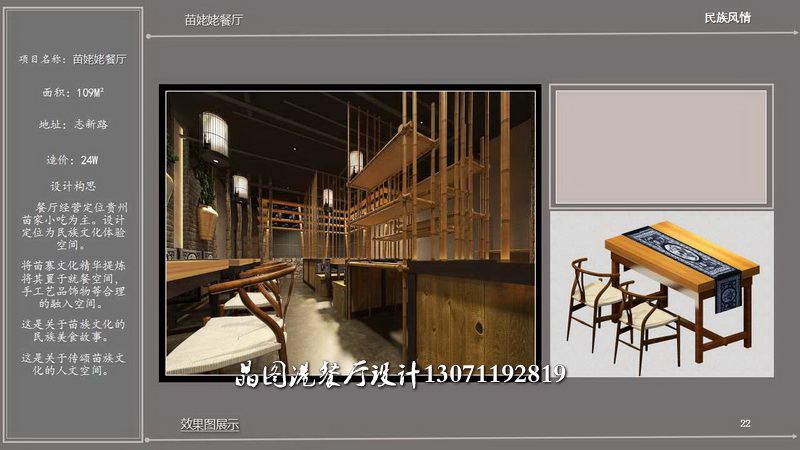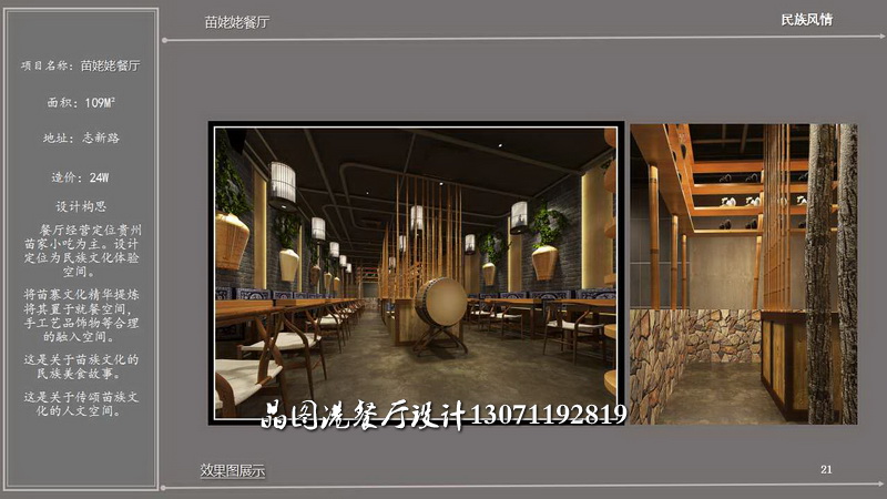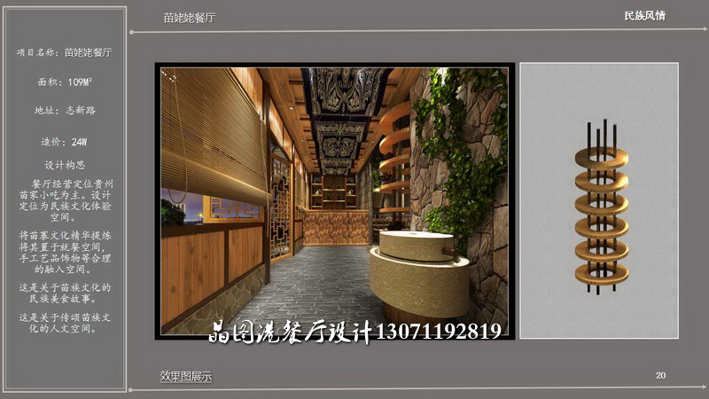 餐廳經營定位貴州苗家小吃為主。設計定位為民族文化體驗空間。