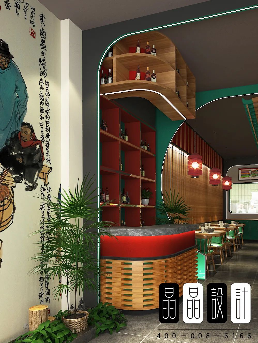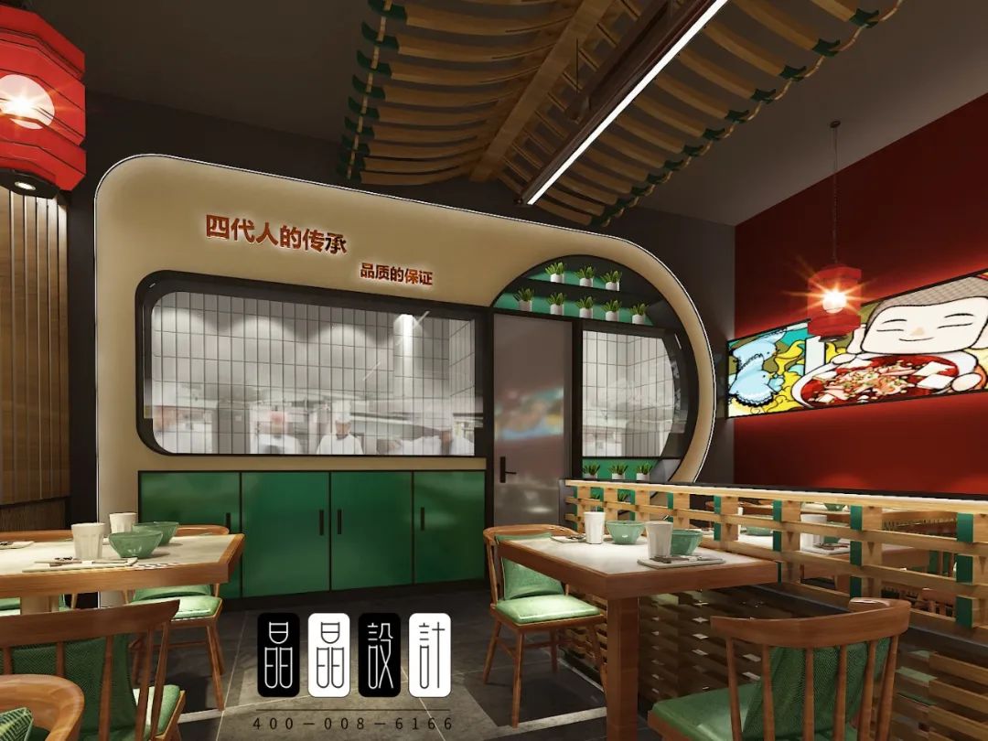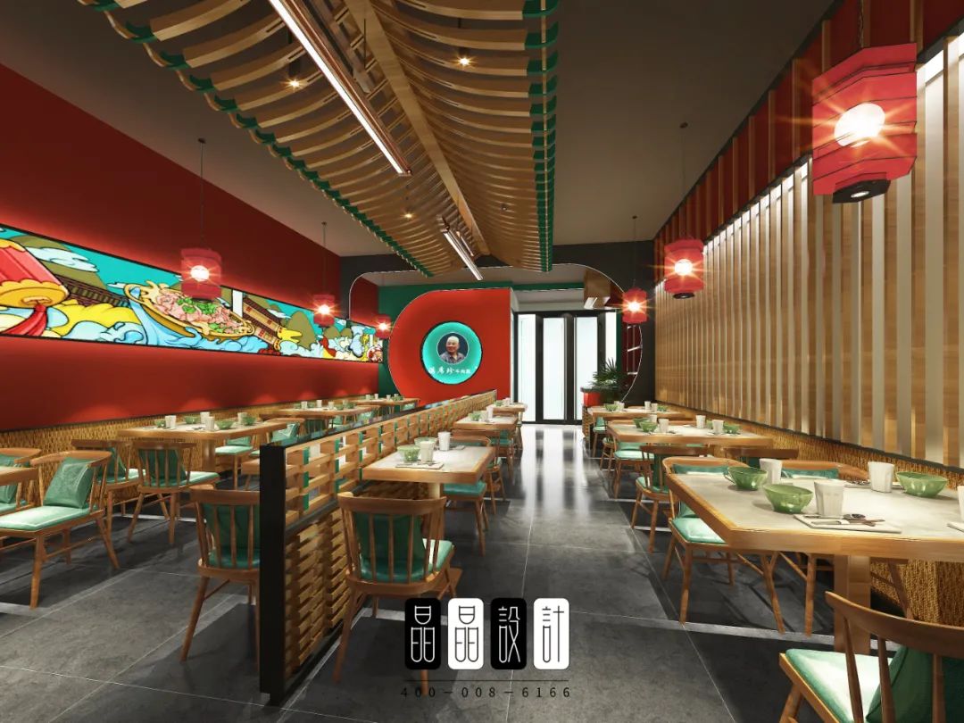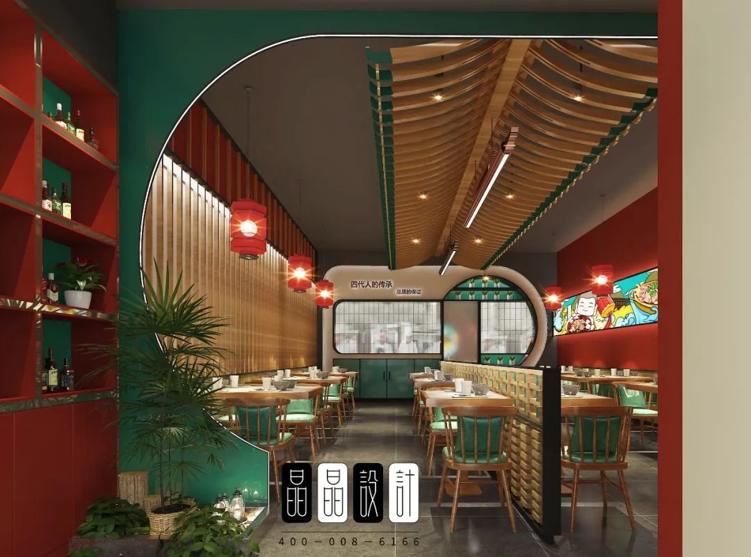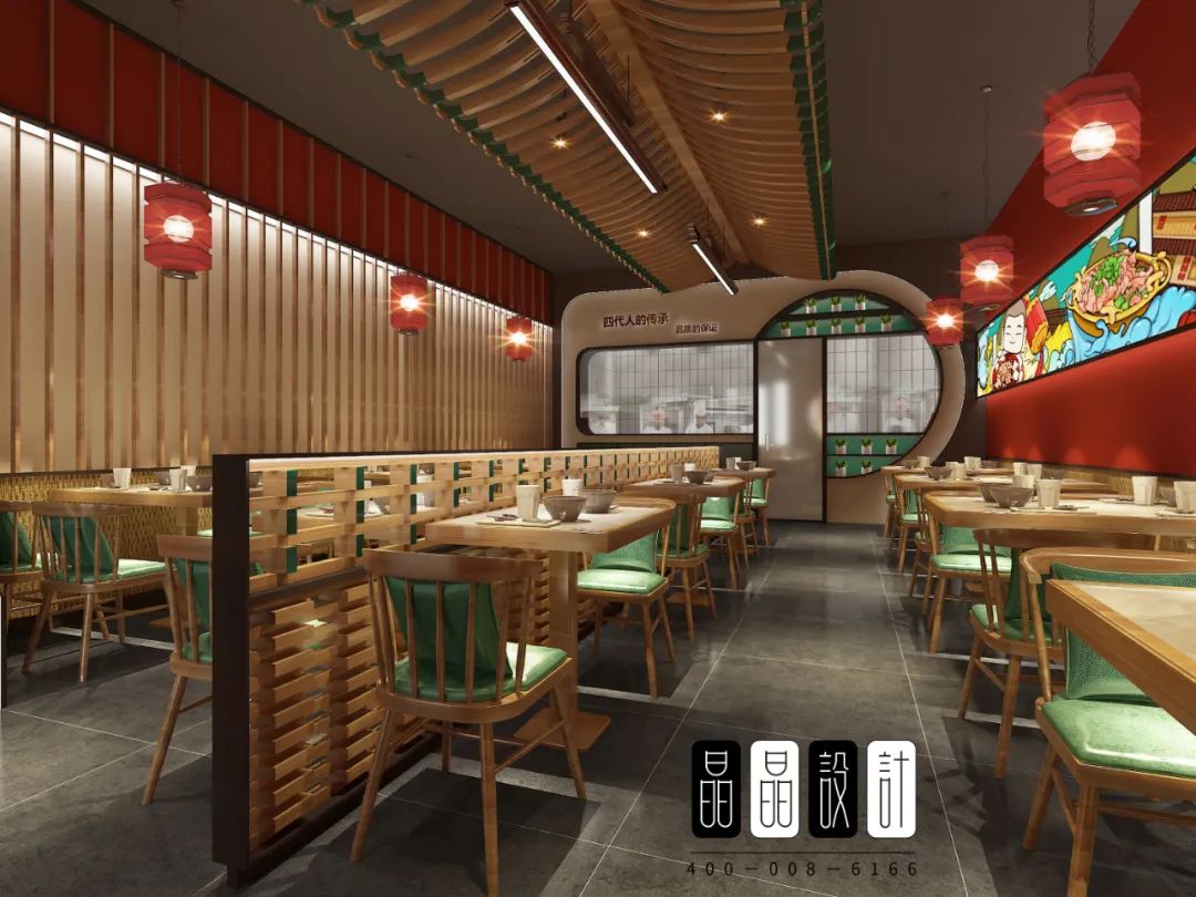作為一家國潮餐廳,餐廳運用了中國經典文化符號。入口處,濃郁的老字號氣息,紅色月亮門就步入眼簾。進入正廳,有老北京特色的大紅燈籠,有年畫風格的海報燈箱,有民居四合院的構件月亮門,斗拱造型的隔斷墻。處處體現著老北京的文化氣息。