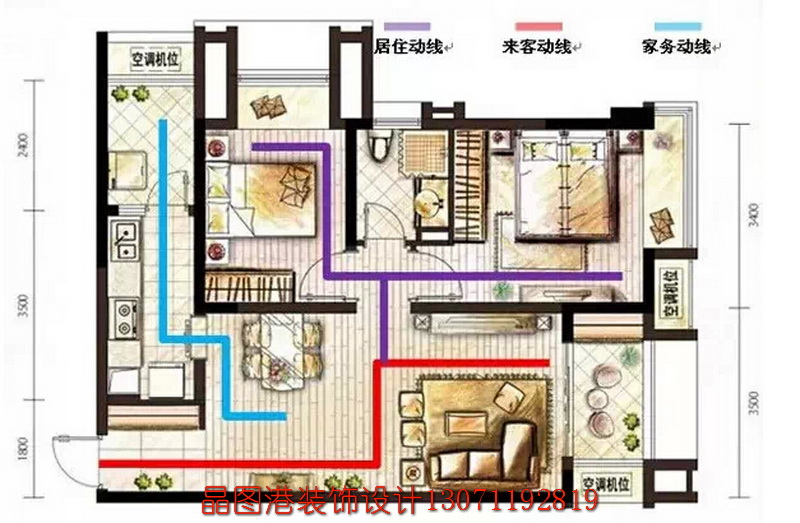 動線是指人們在戶內(nèi)活動的路線,動線流暢與否將影響人們進行各種活動時能否實現(xiàn)順利轉換。戶型的設計影響到動線的走向,而動線的走向會影響到居住的品質(zhì)。好的動線能夠提升小戶型利用率,而差的動線會使大戶型變得“大而無當”,浪費空間。戶內(nèi)主要動線有三類,分別是居住動線、家務動線、來客動線。