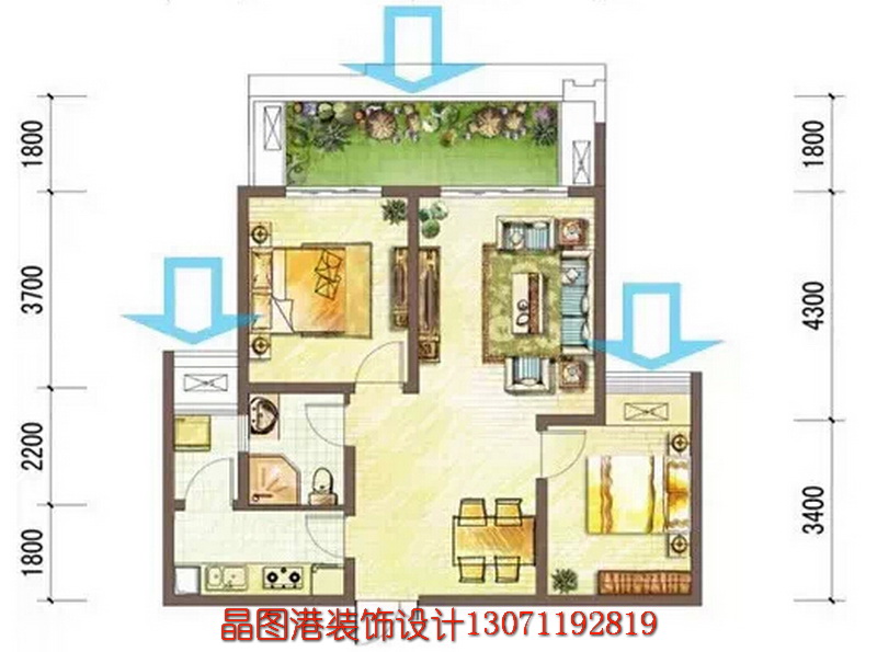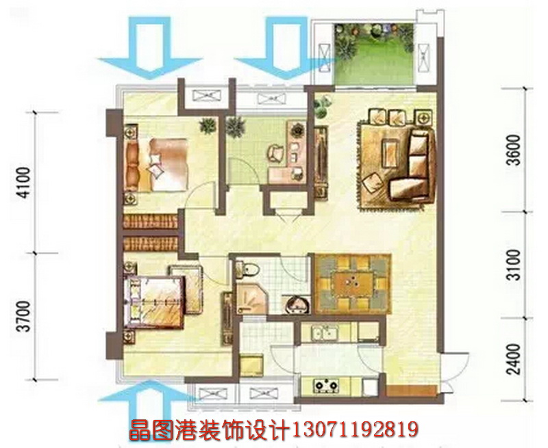 4、通透良好 通透性主要是指戶型的通風和采光性能。要保證戶型具有良好的通透性能,首先要求戶型要有良好的進深開間比,即戶型比較方正;其次戶型最好有兩面可以采光和通風,相對兩面采光通風最佳。