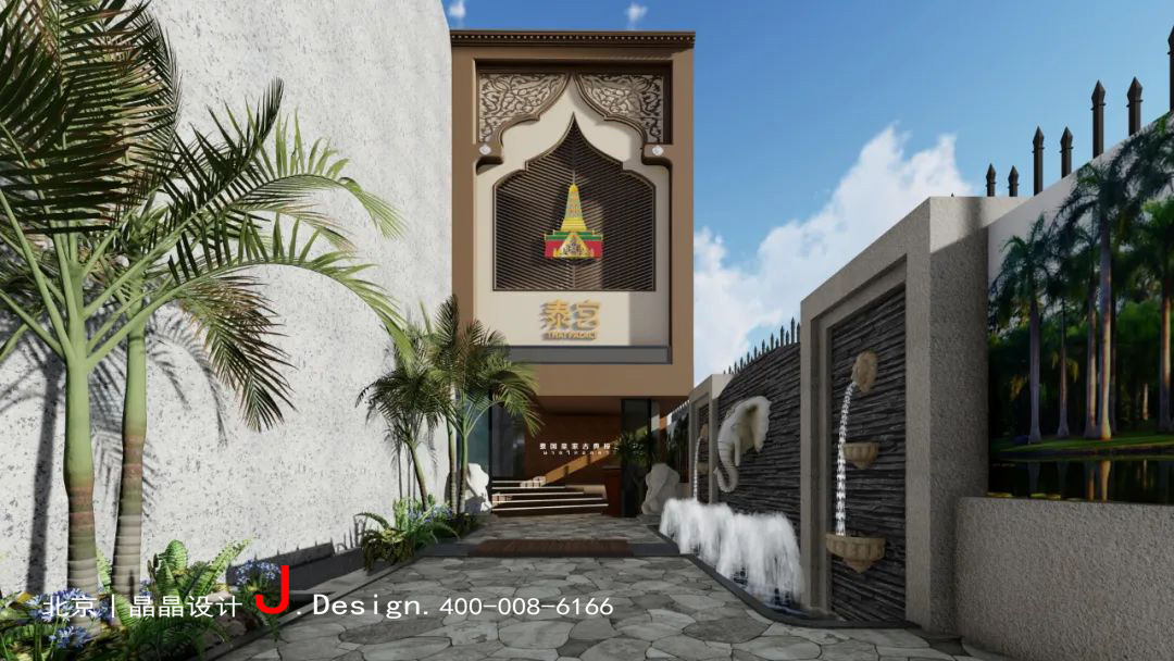 入口前廳提煉以往泰宮店面形象,加入新型異國元素,頂部木色與金色合二為一,葉狀燈具點綴。極具有泰式文化的墻面造型與之呼應。